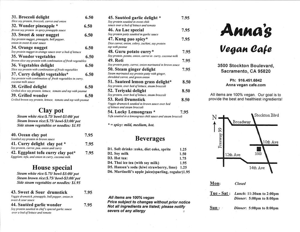 Welcome to Anna's Vegan Cafe, a delightful gem located at 3500 Stockton Blvd, Sacramento, CA. This cozy eatery specializes in vegan versions of traditional Asian cuisine, encompassing flavors from Thai, Mongolian, Chinese, and Indian culinary traditions. The menu features enticing options like the Deluxe Mix Vegetables and mouthwatering Mongolian Wonder, both priced affordably at $4.95. For those craving noodles, the Vegetables Chow Mein offers a satisfying stir-fried mix for $5.95.